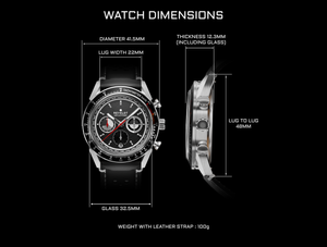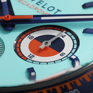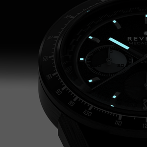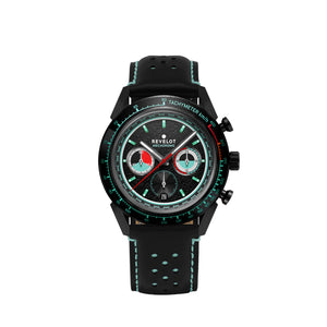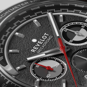 The Revelot Mecadromo features a 41.5mm industry standard 316L stainless steel case with an aluminum tachymeter bezel that serves as a nod to the 70's racing timepieces. The 22mm width multi-faceted lugs are bullhorn inspired with an angular twist with a mix of brush and polish finishes. Resting on top is a single domed sapphire glass with anti-reflective coating underneath packed in just 12.3mm thick.