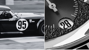 Racing over to the dial, you may pick between an asphalt textured dial or a fully lumed dial surrounded by race flag styled chapter marker and swiss lume filled applied indices. The date wheel is white to mimic the number decals on race cars. Every Mecadromo is designed with racing themed colors in mind, drawing inspirations from famous racing liveries of our time.