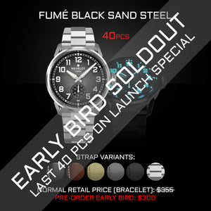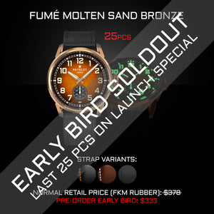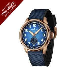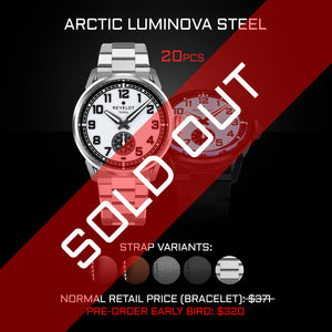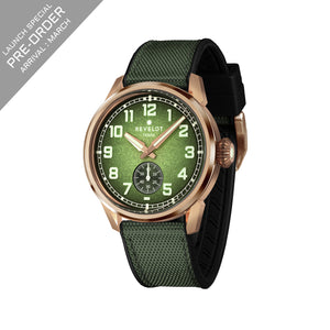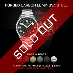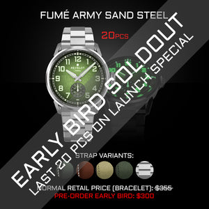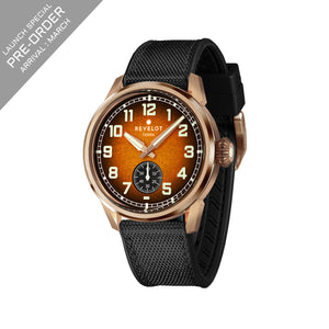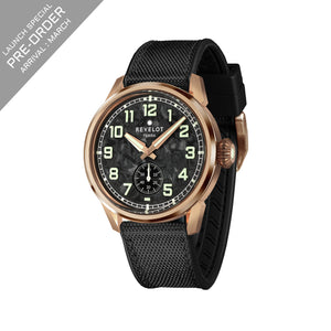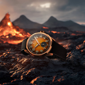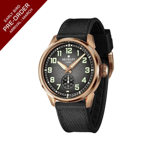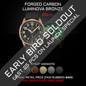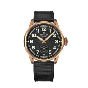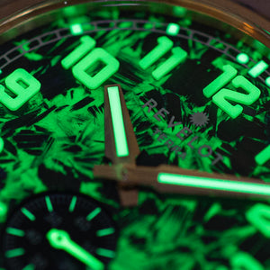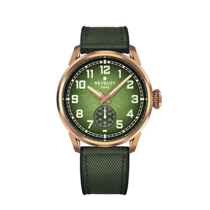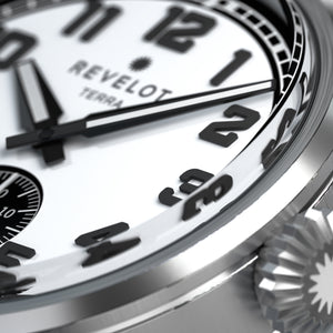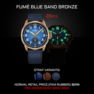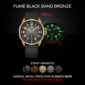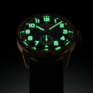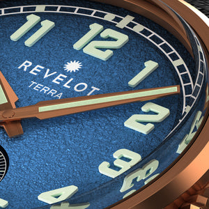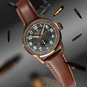 While maintaining the same configuration of the Dirty Dozen field watches, the Terra is a modern interpretation of the classic icon, with a mix of brush and polish finish on chamfers and angles paired with angular bull-horn styled lugs. The 316L Steel or CuSn8 Bronze case is Completed with a domed hat sapphire crystal and anti-reflective (AR) coating for clarity.